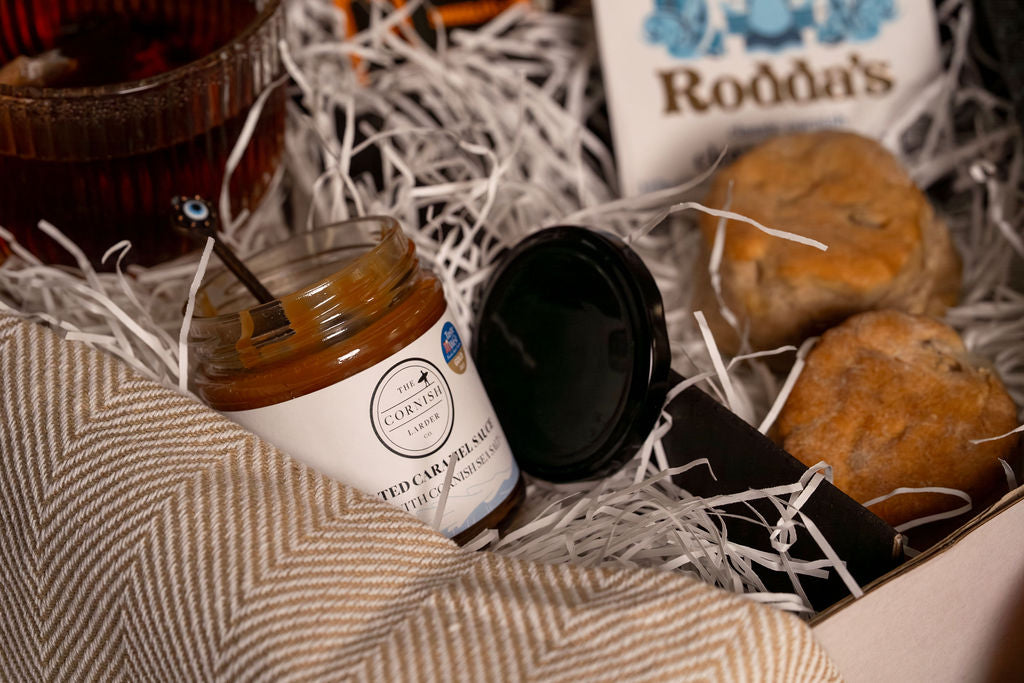 Our Apple & Caramel Cream Tea includes freshly baked Apple Scones, soft and gently sweet with real apple pieces folded through the dough. They’re paired with a silky Salted Caramel Sauce from The Cornish Larder, perfect for drizzling (or spooning… we won’t judge). Finished with Rodda’s iconic clotted cream and a round of Cornish tea, this box is pure comfort — warm, nostalgic, and just right for chilly afternoons.